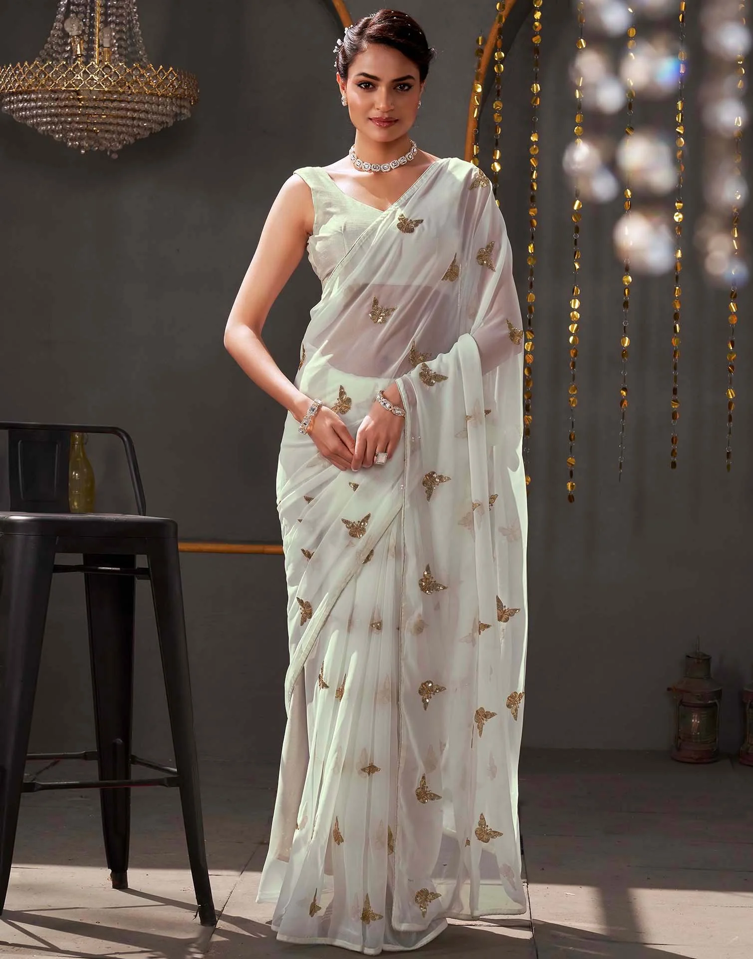 White Georgette Sequence Embroidery Saree